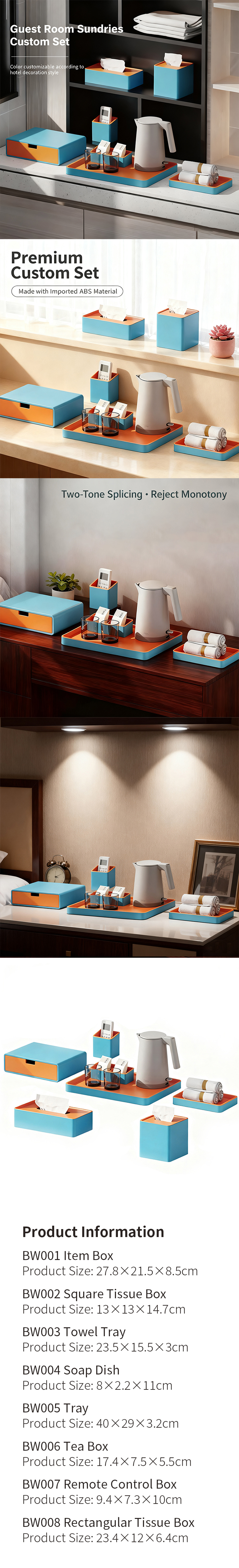 ABS resin toiletries storage box, tray, tissue box, remote control holder, water bottle holder and soap dish for hotel guest room sundries