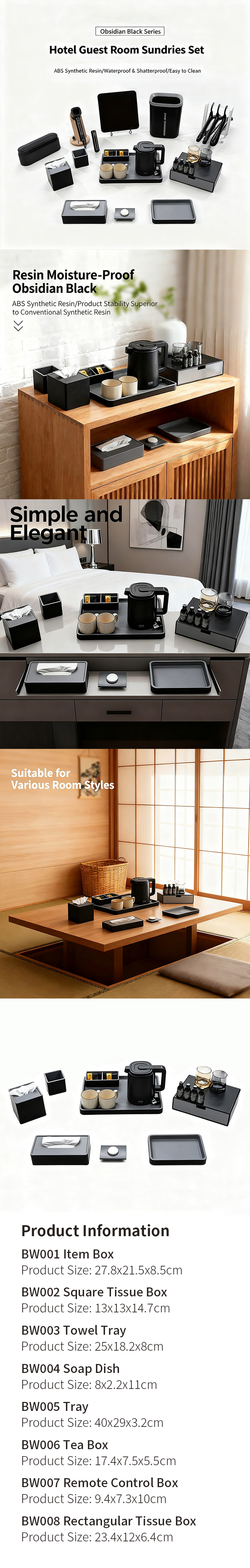 ABS resin toiletries storage box, tray, tissue box, remote control holder, water bottle holder and soap dish for hotel guest room sundries