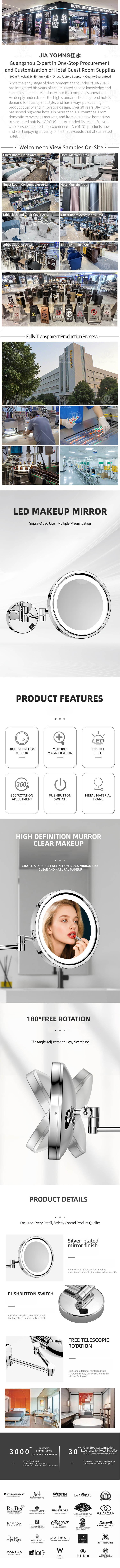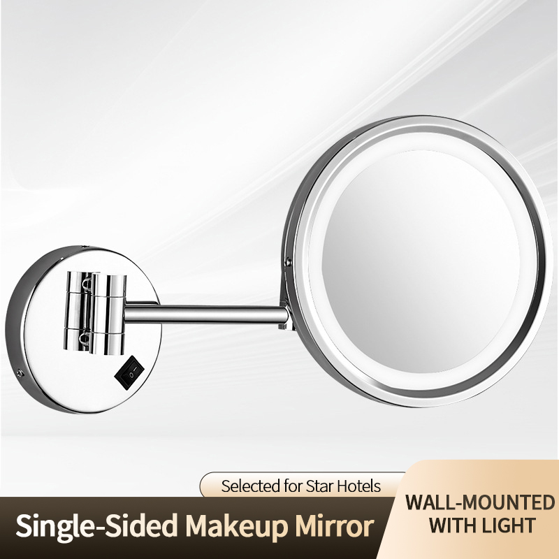 Hotel Bathroom LED Lighted Round Vanity Mirror, Retractable Folding Single-Sided Cosmetic Mirror