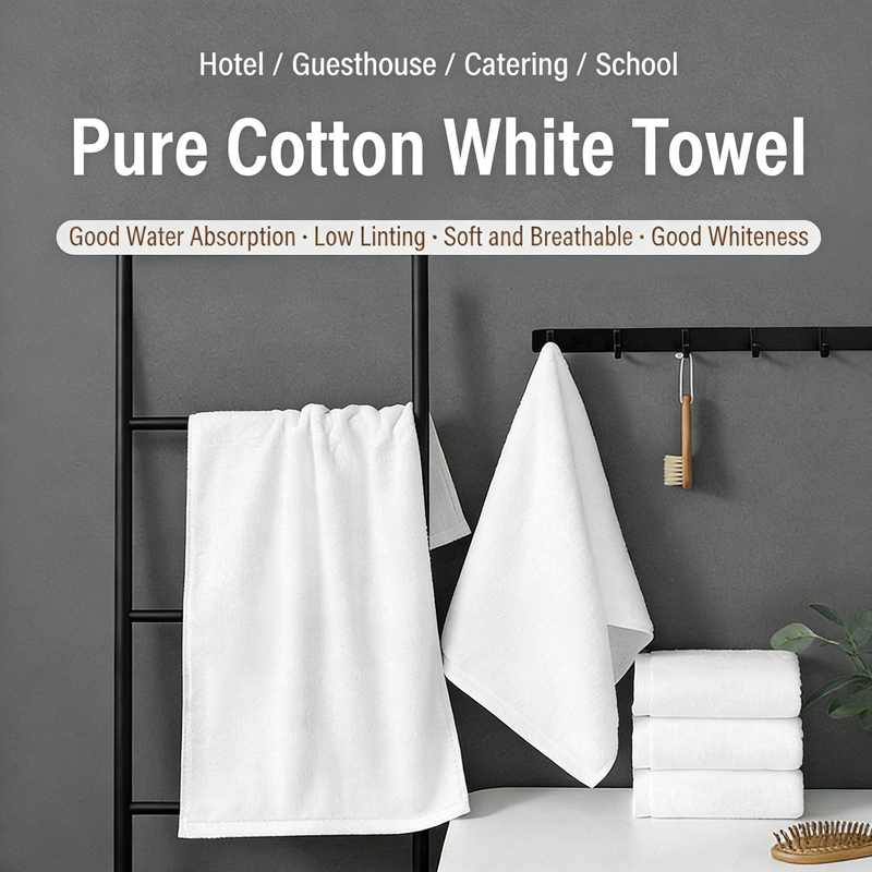 Hotel towels, bath towels, spiral pattern plain weave twill, edged cotton white absorbent towels, hotel B&Bs, five-star hotel towels