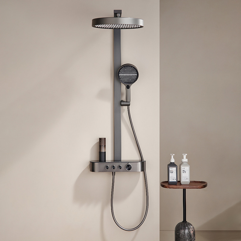 Solid Brass Complete Shower Set, Wall-Mounted Shelf Bathroom Hot & Cold Pressure Boosting Digital Display Shower System