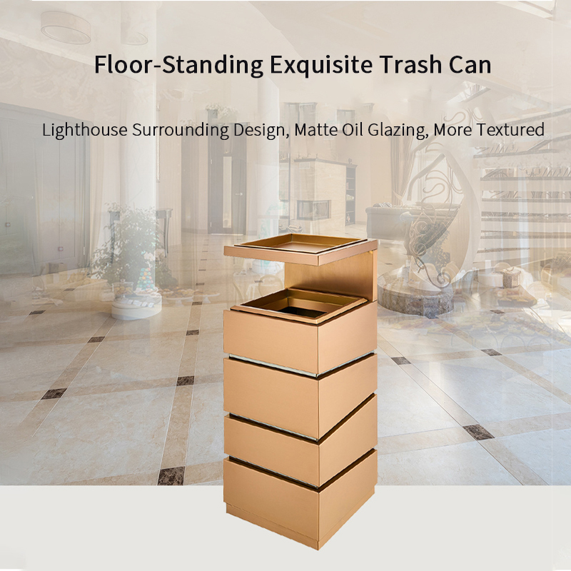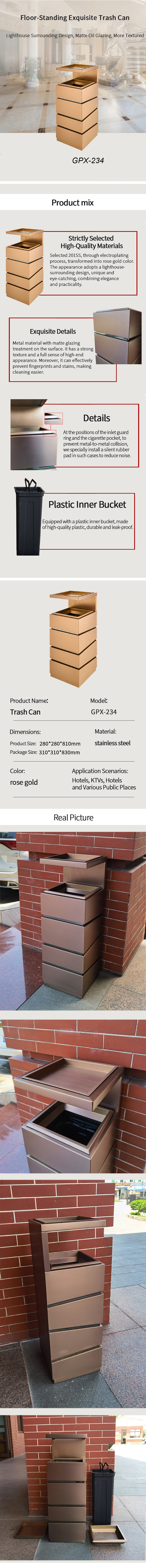 Stainless Steel Trash Can with Ashtray Pocket for Hotel Lobby / Rose Gold Trash Can